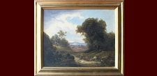 Obraz, „Romantická krajina “, olej /plátno 55,5 x 68,5 cm rámováno zlaceným rámem 33 x 26 cm, Nesignováno, obraz je ve velice dobré kondici po restaurování s rentoaláží na nové plátno.